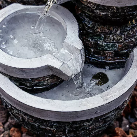 La fontaine à cuvette Cascade Garden Fountain est un ensemble de colonnes de différentes hauteurs, chacune couronnée par un bol. Leau coule doucement den haut sur plusieurs étages vers le bas. De là, il est transporté de manière fiable vers le haut par la pompe. La pompe tire son énergie via le bloc dalimentation de lalimentation électrique ordinaire. La fontaine de jardin est en polyrésine plastique résistante.