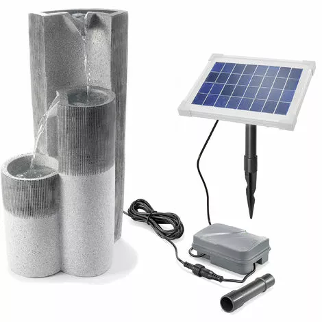 La fontaine solaire de jardin Smart Fountain avec batterie rechargeable est une fontaine cascade moderne en polyrésine gris clair. Leau coule sur trois stèles à différentes hauteurs. Une fois quelle a atteint le fond, la pompe la remonte en circuit fermé. Équipé dun panneau solaire puissant, vous pouvez installer la fontaine intelligente nimporte où dans votre jardin, à condition que le panneau solaire reçoive suffisamment de lumière solaire pendant la journée.