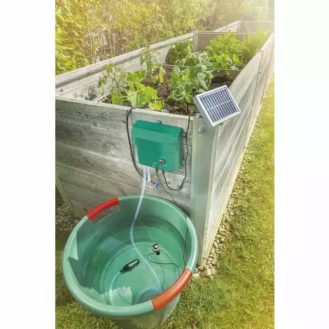 Cette pompe, intégrée dans le boîtier, puise l’eau jusqu’à une profondeur de 2 m, par exemple dans des citernes, des seaux ou des étangs.