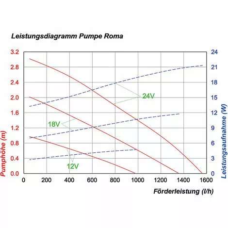 - Hauteur de refoulement à 12 V : max. 0,8 m, à 24 V : max. 2,8 m