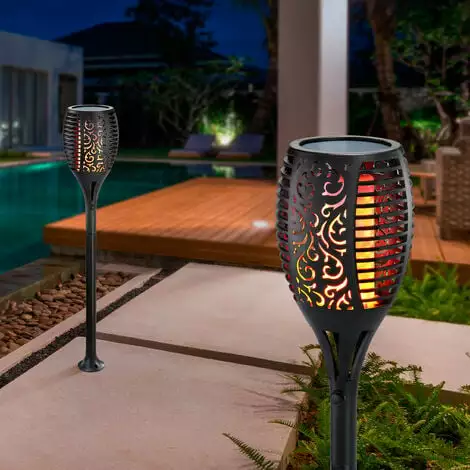 Le puissant module solaire intégré au couvercle garantit une charge optimale de la batterie au soleil. Après le début de lobscurité, la lumière de la flamme sallume automatiquement. Montage, au choix avec piquet de terre ou plaque de montage. Livraison : Kit de 2 !